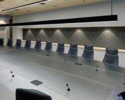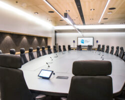 Boardroom 311 is a prestigious high tech venue ideal for board or private meetings. Appointed with an imposing 26‑seat glass table equipped with integrated table boxes, this contemporary boardroom boasts a range of multimedia functionalities and technologies that facilitate interactive discussions and quality communication during presentations. Equipment includes microphones, screens, and cameras for videoconferencing as well as integrated touchscreen control panels for A/V, ventilation, and lighting. Boardroom 311 is located right next to Client Lounge 310.